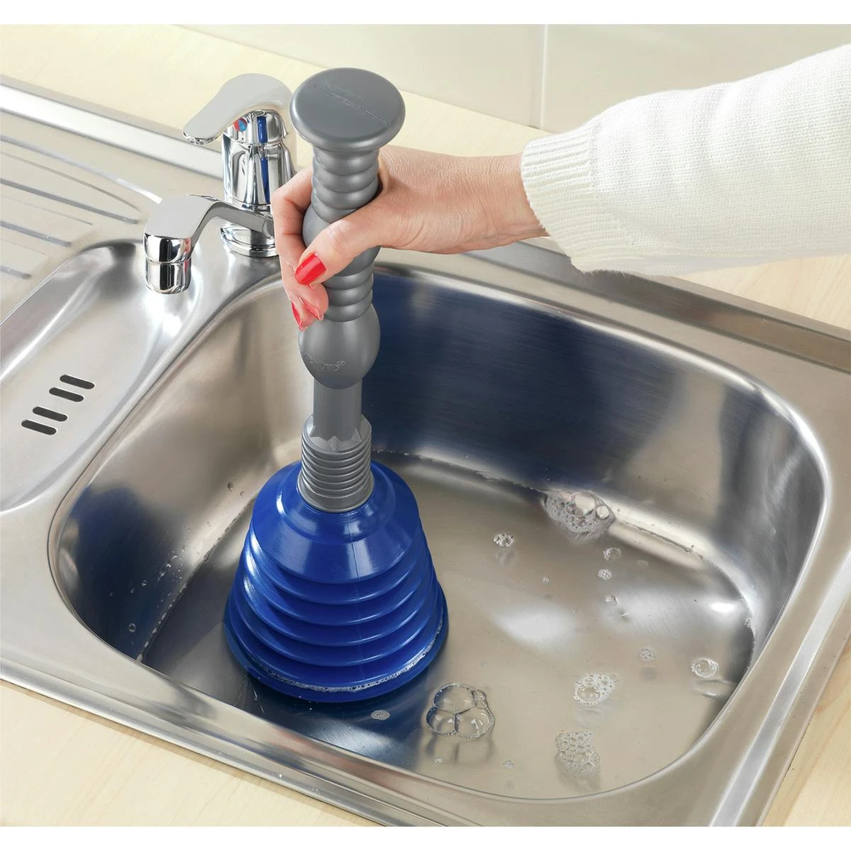 Verstopfte Toiletten und Abflüsse sind ein unnötiges Ärgernis, das Sie vermeiden können. Das Besondere an dem Rohrfrei-Duo ist die spezielle Luftdruck-Technik. Es schiebt die Verstopfung aus dem engen Rohrabfluss in das größere Fallrohr. übliche Saugglocken ziehen die Verstopfung in das schmale Rohr hinauf und können Rohrbeschädigungen verursachen. Ein Wechselgriff mit zwei Druckaufsätzen: Der große Druckaufsatz eignet sich für Toiletten. Der kleine Druckaufsatz ist perfekt für kleinere Abflüsse in der Küche und im Bad. Das Rohfrei-Duo löst Verstopfungen ganz ohne Chemie, nur mit Luftdruck. Das Set besteht aus: 1 Druckaufsatz Ø 15,5 cm, 1 Druckaufsatz Ø 12,5 cm und 1 Griff 28 cm passend für beide Aufsätze.